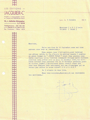 Grâce à Louis Cance, nous pouvons reproduire quelques courriers qu’il avait échangés à l’époque (il avait 19 ans !) avec les éditions Jacquier. On découvre ainsi que l’éditeur avait l’intention de passer JOHNNY TEXAS en petit format et en couleurs. Cette transformation, prévue pour novembre 1959, n’a pas eu lieu.