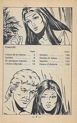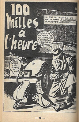 • 100 milles à l’heure – 20 pl. (Série SUSPENSE n°2 : Cien millas por hora – 20 pl.) – Scénario de Juan Almirall et dessins d’Aldo. Réédition de RAIDS n°1 (11.1962) [les signatures, présentes dans RAIDS, ont été effacées]. Paru en Espagne dans RELATOS DE SUSPENSE n°1 (15.9.1963)
