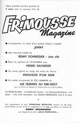 Elle se transforma en FRIMOUSSE MAGAZINE après seulement deux numéros car elle ne satisfaisait pas aux critères exigés pour obtenir le numéro de commission paritaire (au moins deux histoires par numéro ainsi qu’un certain pourcentage de textes).