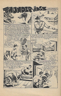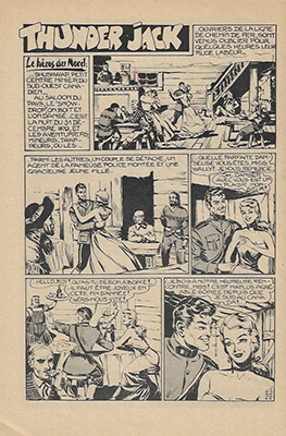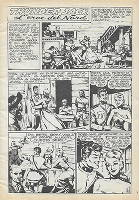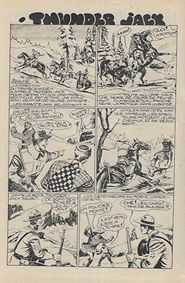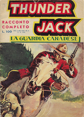Thunder Jack est un héros de la Police Montée Canadienne, dans l’esprit de King of the Royal Mounted, célèbre bande dessinée américaine d’avant-guerre issue d’une série de romans de Zane Grey. Le personnage de Thunder Jack a été créé par Vittorio Longo (qui signait du pseudonyme de Vick Loney) sous forme romancée dans une série de 14 fascicules intitulés POLIZIA A CAVALLO publiés par les éditions Giovanni De Leo en 1950. Une version en bandes dessinées, écrite par De Leo et dessinée par Gallieno Ferri, est parue chez le même éditeur dans le n°3 daté du 25 octobre 1952 de l’hebdomadaire AVVENTURE. Elle fut interrompue au n°8 avec l’arrêt de ce journal. Cette première histoire a été reprise et complétée dans un fascicule intitulé « Thunder Jack la guardia canadese » et daté du 15 août 1953 : elle correspond très exactement à l’histoire publiée dans P’TIT-GARS n°2 à 6.