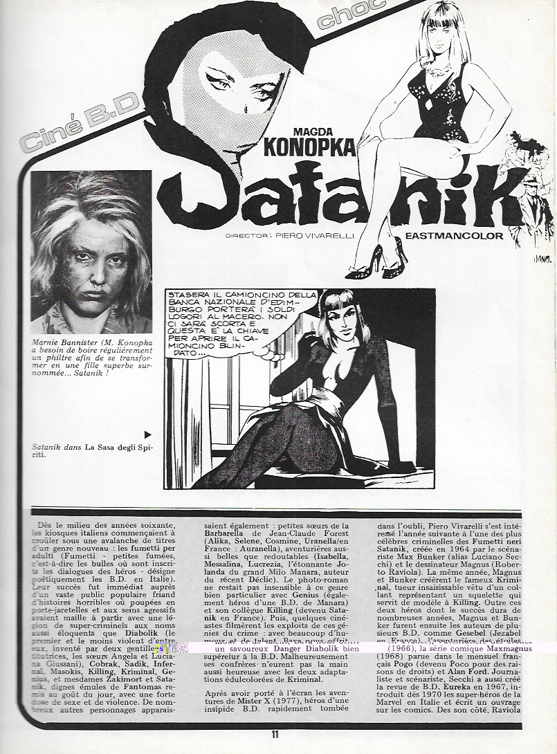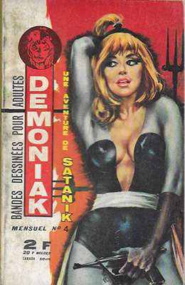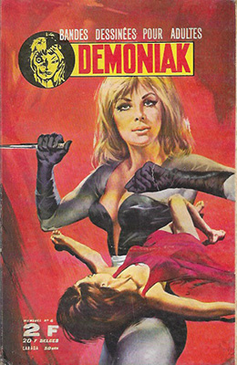 Précisons que si la version française a été publiée sous le titre générique de DÉMONIAK, c’est que le titre SATANIK avait été déposé en mai 1966, pour la traduction d’un photo-roman italien pour adultes intitulé KILLING. Ces différentes transformations d’un pays à l’autre ne manquent pas de dérouter certains amateurs de BD ! Pour ajouter encore à la confusion, mentionnons un « Fumetti Neri » titré DEMONIAK en Italie (30 numéros parus de février 1965 à juillet 1967) et traduit sous le nom de SATANEX aux éditions Bel Air.