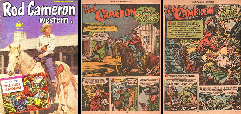 Rod Cameron (1910-1983) était l’un de ces nombreux acteurs de westerns de série B qui firent l’objet d’une publication en comic-book : 20 numéros ont été publiés de février 1950 à avril 1953. Les dessins du héros-titre sont attribués à Bob Butts, mais sous réserve. AVENTURES BOUM a traduit les numéros 18 à 20.